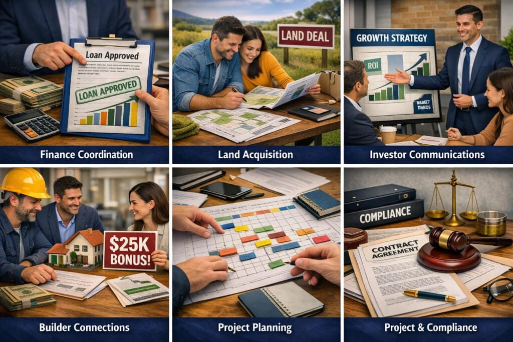 - Builder network access and partnership coordination so your development pipeline moves smoothly.